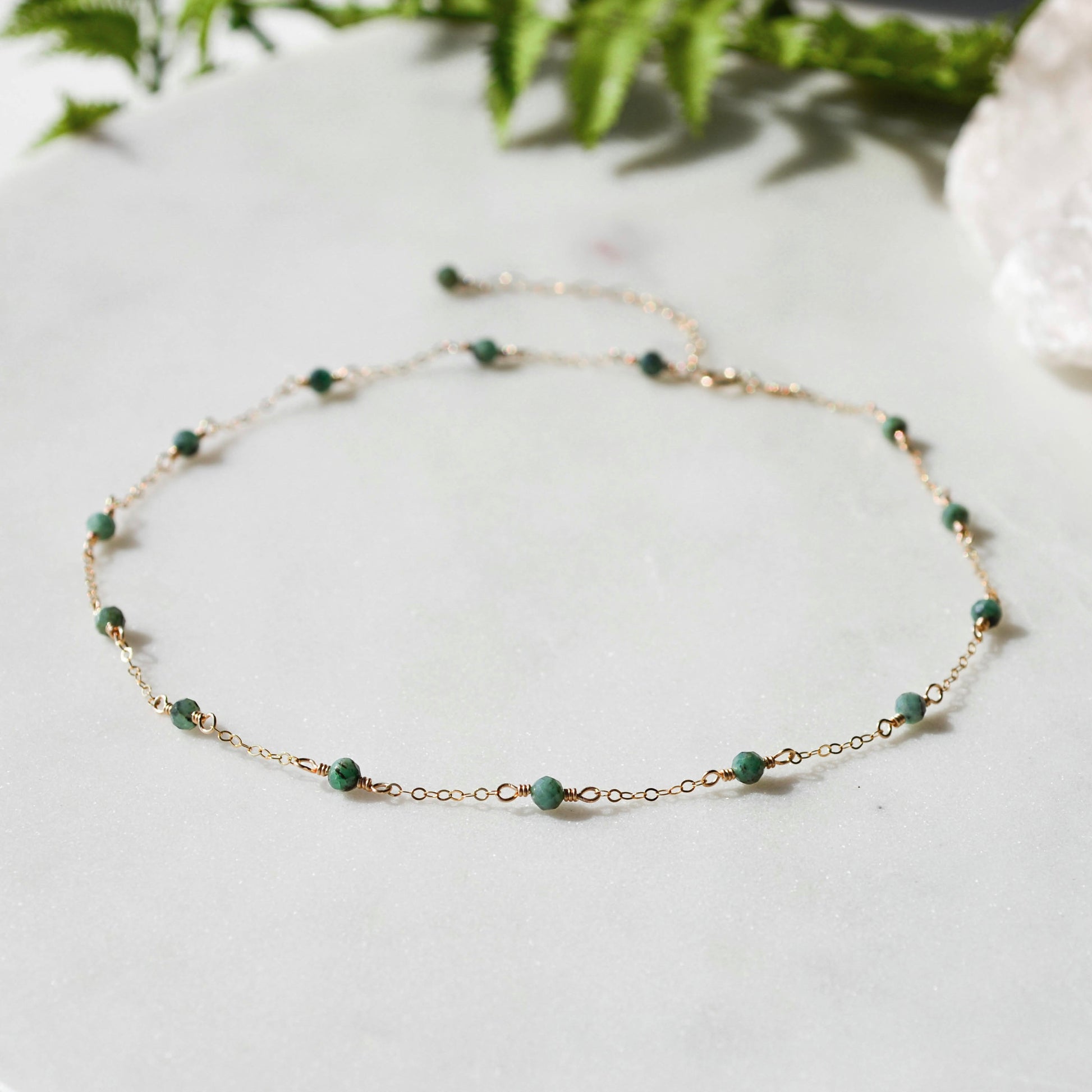Faceted Emerald gemstones are hand wrapped along a dainty 14K gold filled or sterling silver chain.